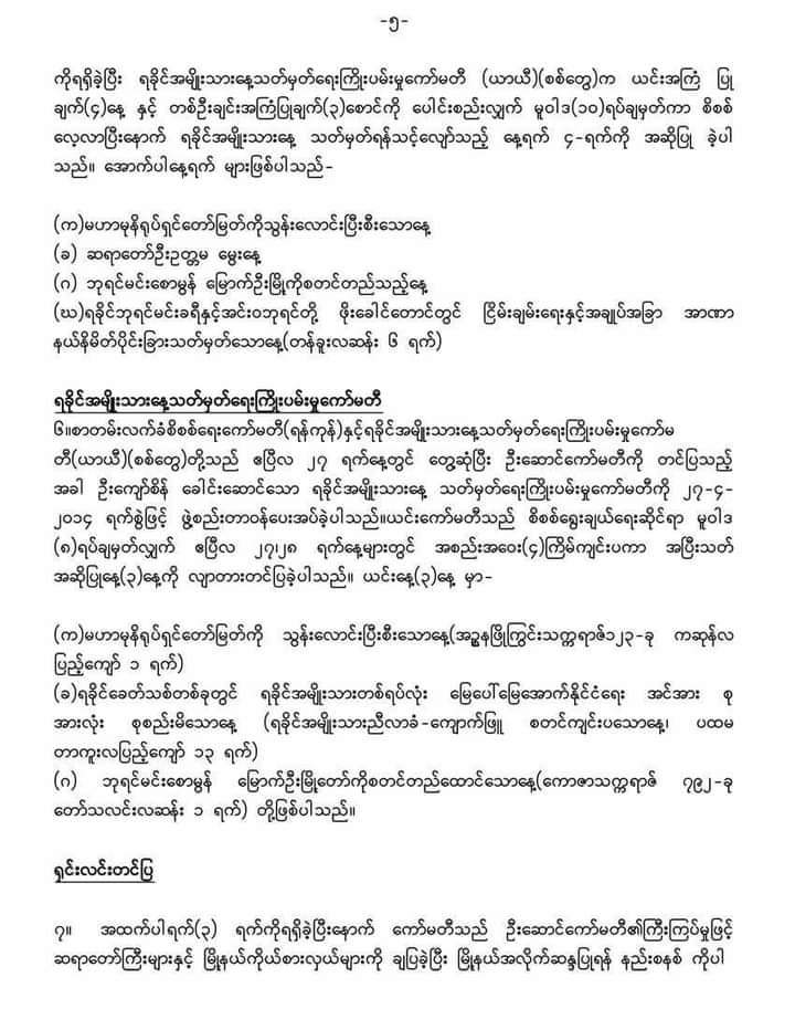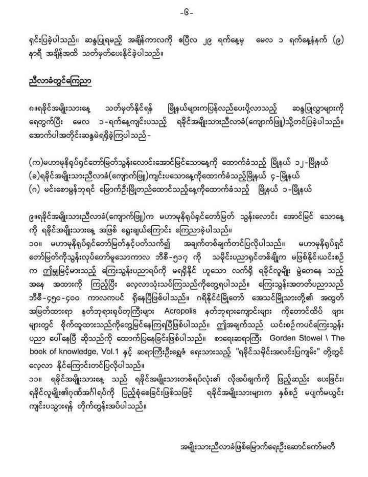 ၄။ ယင်းကော်မတီကပင် အစည်းအဝေး ( ၇ ) ကြိမ်တိုင်တိုင် ပြုလုပ်ပြီး မူဝါဒ ( ၁ဝ ) ရပ် ချမှတ်ကာ အပြီးသတ် စီစစ်လျာထားသည့် နေ့ရက် ( ၄ ) ရက်ကို အမျိုးသားလာခံ ( ကျောက်ဖြူ ) သို့ ပေးပို့ခဲ့ပါသည်။